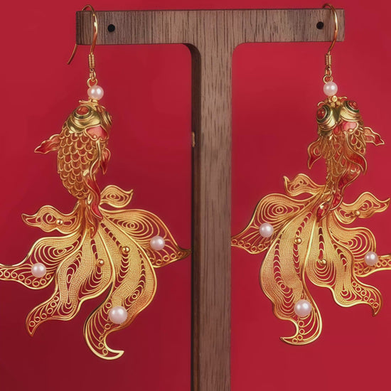 Lucky Koi Filigree Enamel Earrings | Freshwater Pearl Drop | Vintage Chinese Totem Jewelry